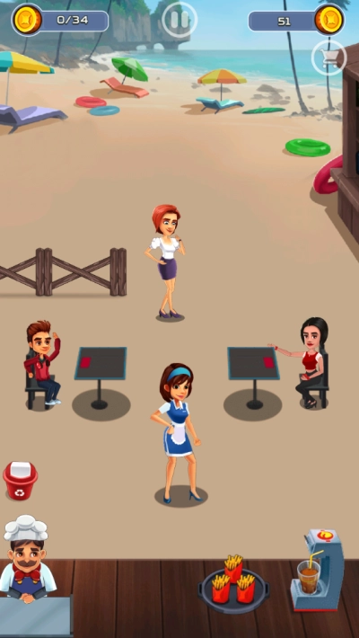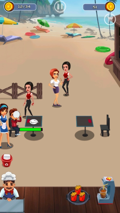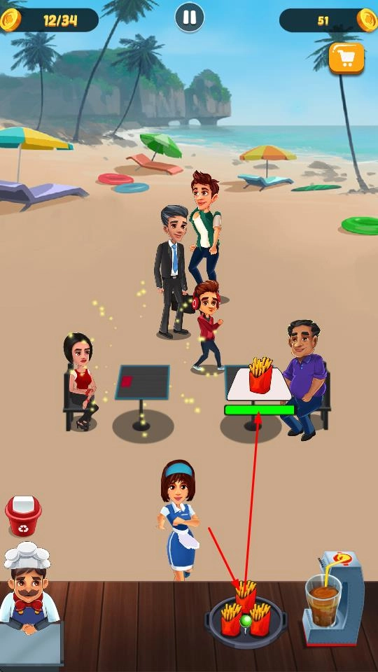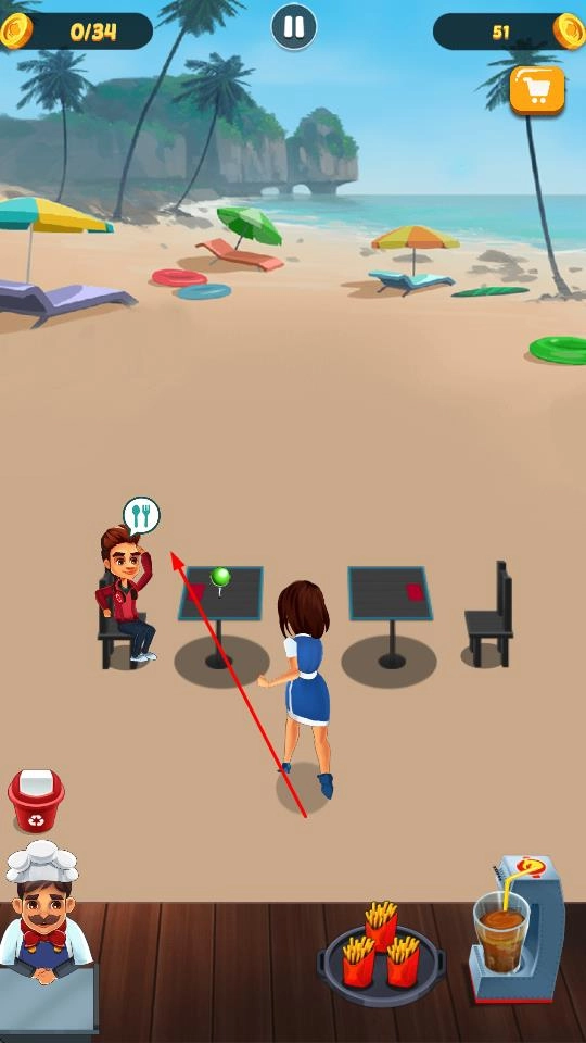 在海滩餐厅的场景里,要留意顾客头顶的点餐标识,及时回应他们的需求,为接下来的服务工作做好准备。