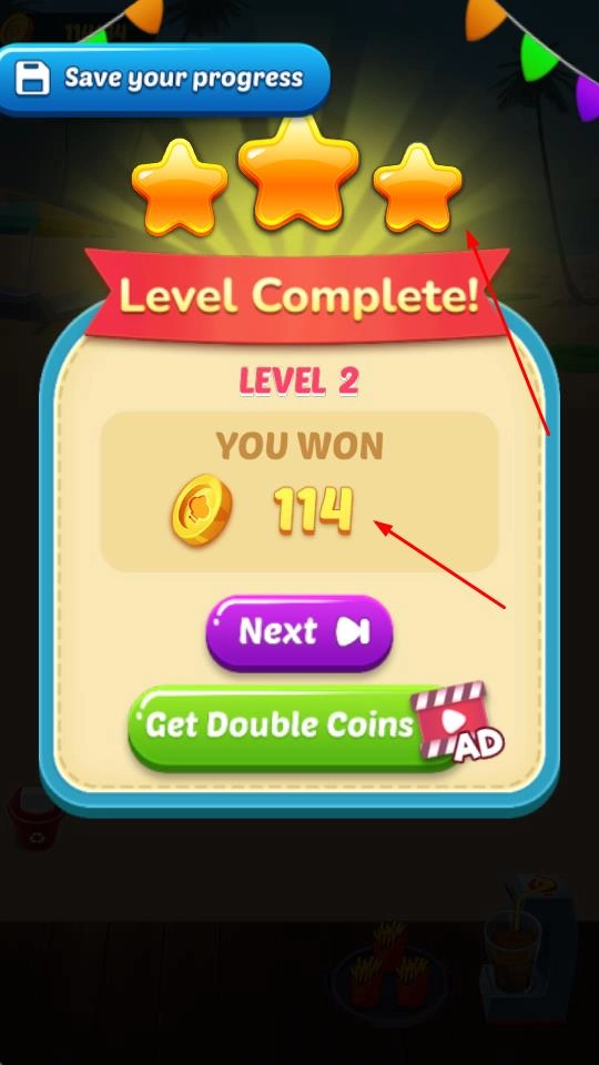 成功闯过关卡后,你能得到金币奖励和星级评定,点击Next就能进入下一关,接着经营餐厅。