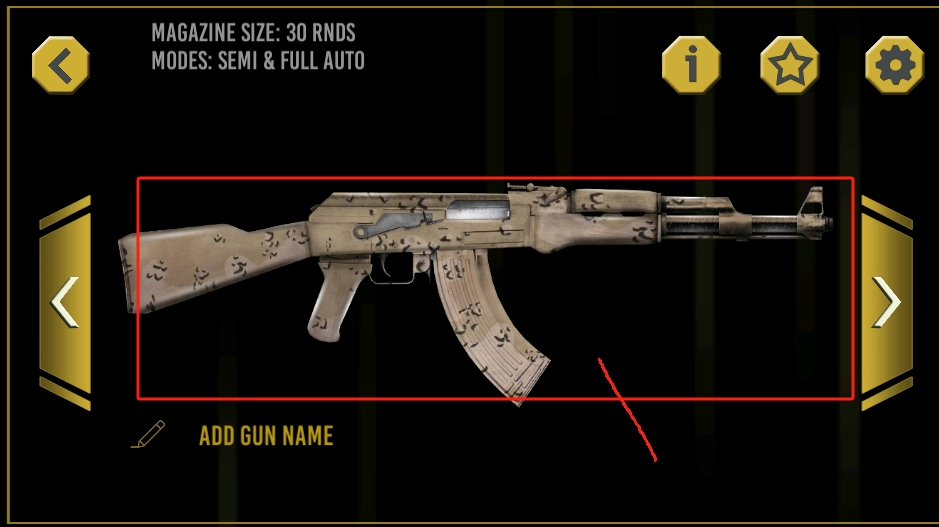 请看红色框内的AK47参数,点击右下角的黄色星星来收藏这把枪。