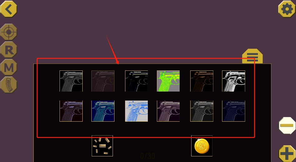 点击红色框内任意一个手枪图案,花费30金币即可解锁新武器。