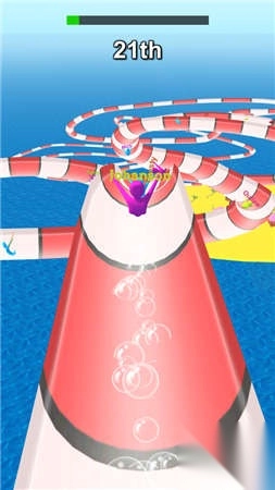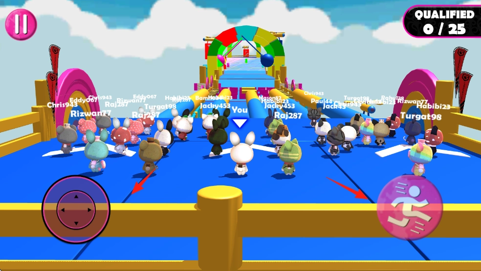 在竞速关卡中,通过左侧摇杆(红箭头标识)调整方向,借助右侧技能键(红箭头标识)实现加速,目标是超越其他糖豆人对手。