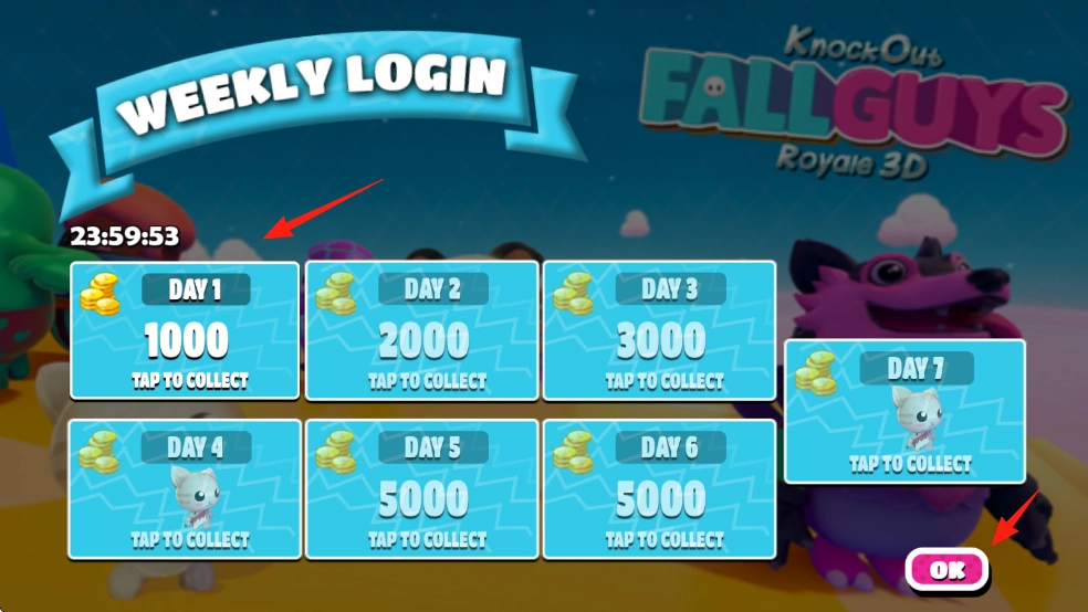 进入WEEKLYLOGIN签到界面后,找到标注为DAY1-7奖励的区域(有红色箭头提示),依次领取金币和皮肤奖励,最后点击【OK】按钮完成确认操作。