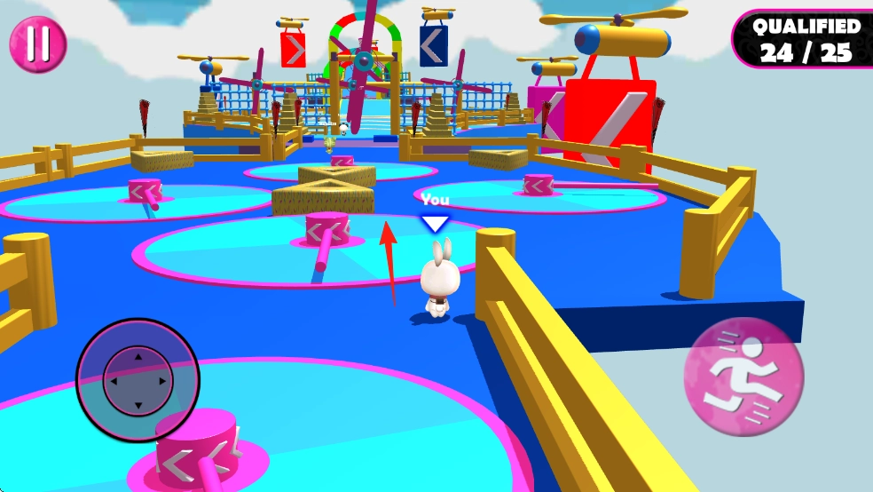 遇到旋转锤障碍时,按照红箭头指示的路线前进,避开锤子、跳上平台,维持当前排名(QUALIFIED24/25),全力冲向终点。