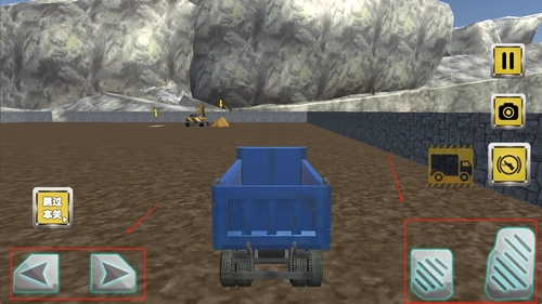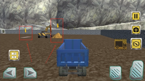 左侧区域用于移动控制,右侧分布着挖掘臂和铲斗的操作按钮,上方则显示任务进度与时间限制,能帮助操作人员及时掌握当前作业状况。