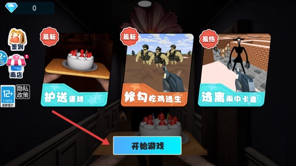 在游戏主界面找到护送蛋糕模式并选中,接着点击界面下方的蓝色开始游戏按钮,就能进入护送蛋糕的挑战关卡了。