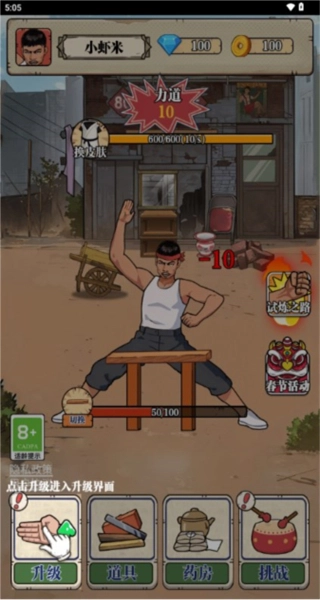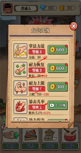 进入升级界面后,消耗金币提升掌法力道等属性,等级提升可增强角色能力,助力后续挑战。