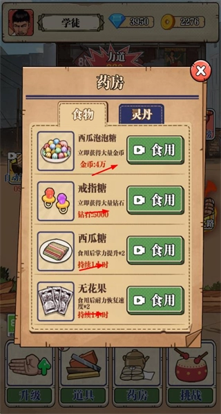 在药房界面,消耗金币使用食物类道具,能够获得金币加成之类的增益效果,从而加快资源获取的速度。