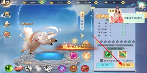 在坐骑界面中点击一键进阶按钮,消耗对应的道具就能提升坐骑等级,从而增强它的属性和战力加成。
