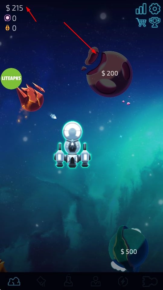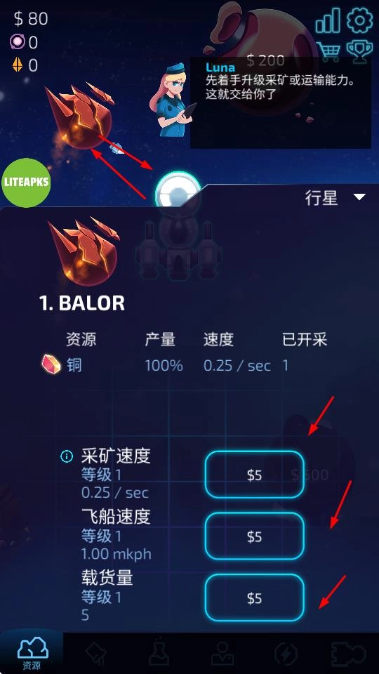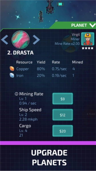 在太空场景里挑选行星开展采矿作业时,能够通过消耗金钱来升级采矿速度、飞船航行速度、载货容量等各项能力,以此提高资源的获取效率。