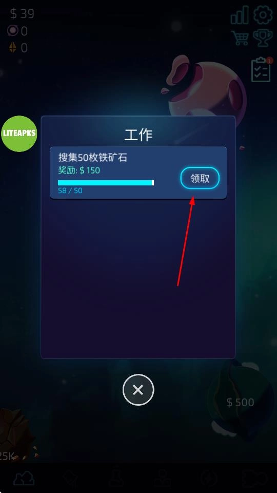 在完成铁矿石等资源的搜集任务后,点击领取按钮即可获得奖励金钱,这些金钱能帮助提升采矿能力,加快资源收集的进度。