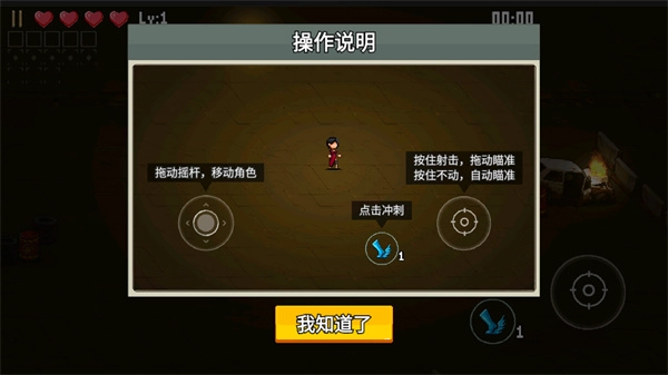 进入游戏后,玩家能够借助摇杆操控角色移动,点击鞋子形状的按钮可躲避怪物,点击瞄准按钮就能进行射击。