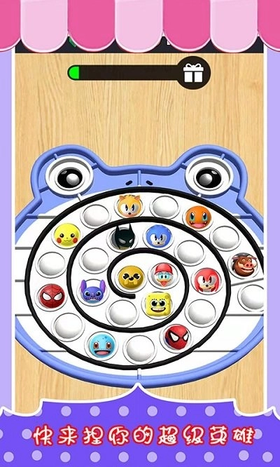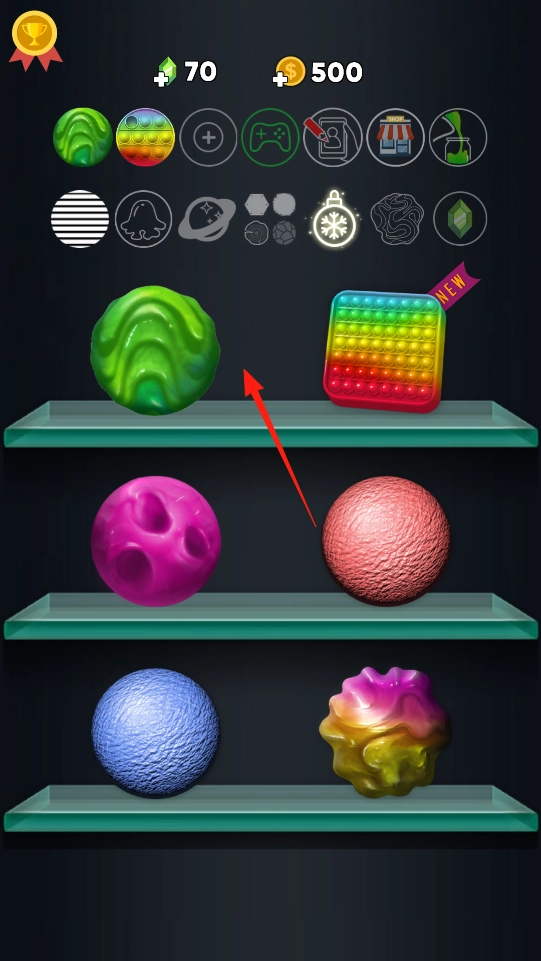 进入玩具挑选界面,点击带有绿色纹理的玩具球,选中之后就能进入互动环节,在这个环节里可以对玩具进行捏压、揉搓之类的操作,从而感受解压的触感,还能通过选择不同的玩具,体验多种多样的解压玩法。