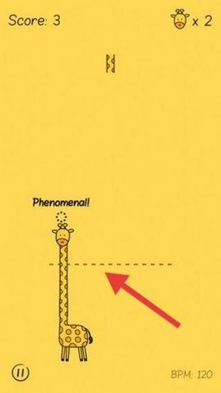 在游戏进行时,通过操作箭头方向,使长颈鹿的头部触碰到相应位置,即可获得“Phenomenal!”的评价,并增加3分(Score:3)。