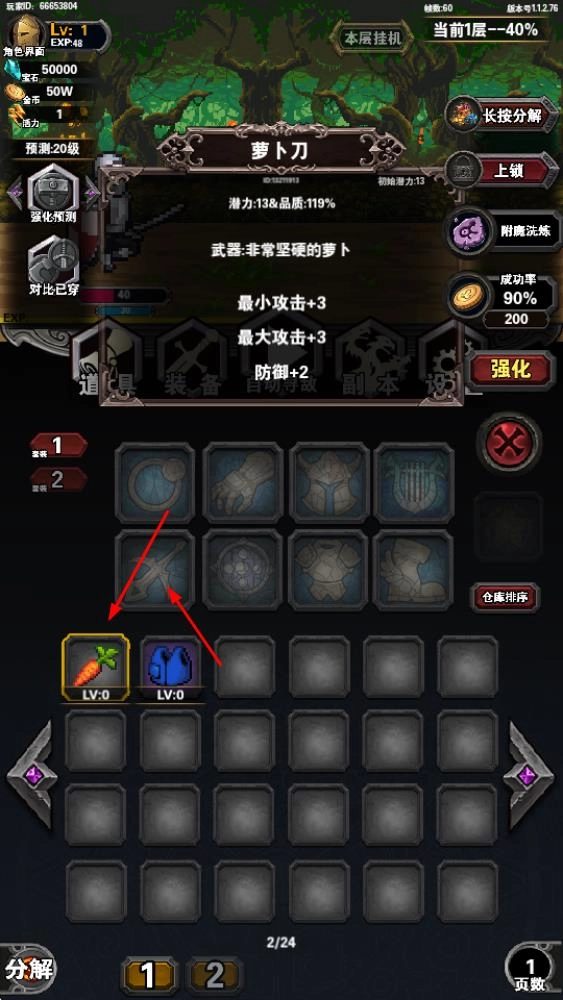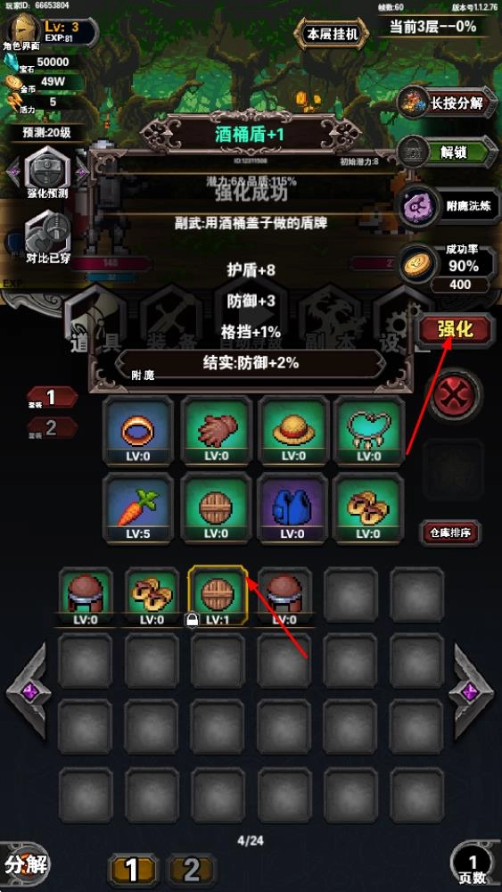 进入游戏后,能够获取萝卜刀、酒桶盾之类的装备,点击强化按钮耗费材料来提高装备的属性,比如攻击、防御等,以此增强战斗能力。