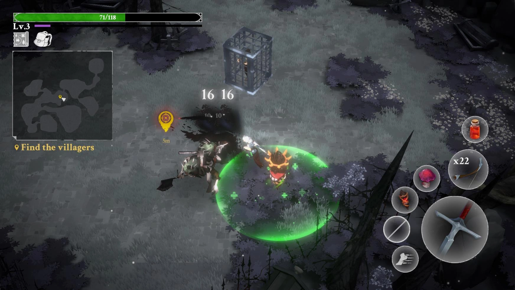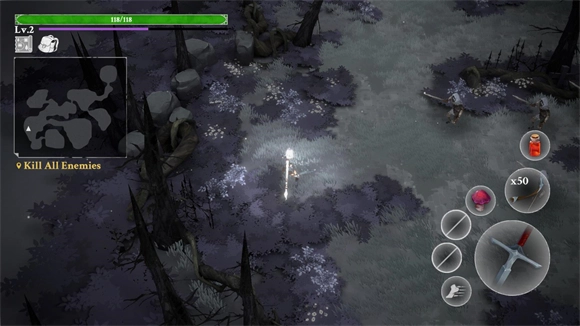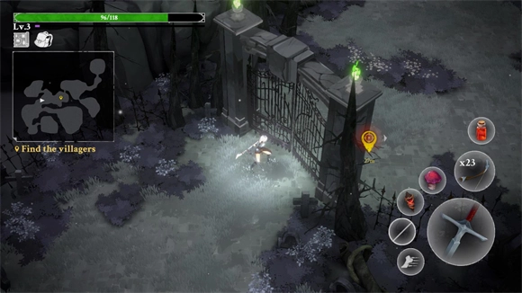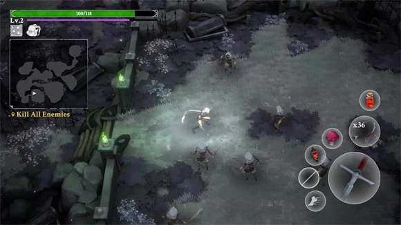 进入关卡后,左侧负责操控角色移动,右侧则用于控制角色的攻击、闪避动作以及道具的使用。