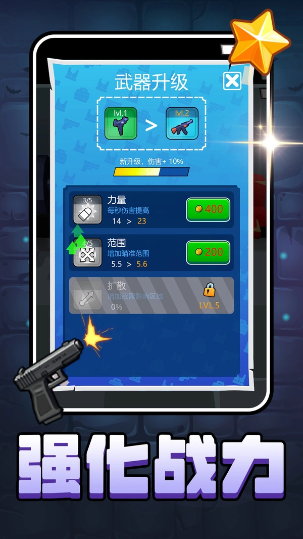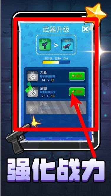 武器强化界面:消耗金币可提升攻击力与射程,解锁更高级的武器特性,助力你增强火力、提升关卡推进速度。