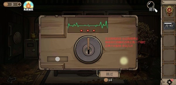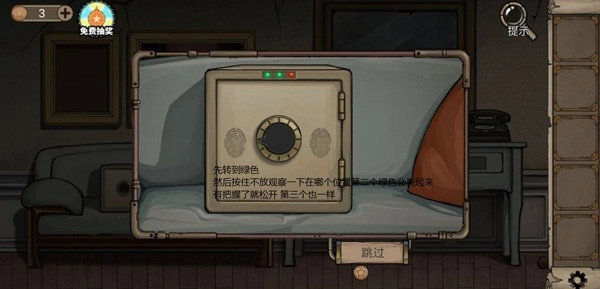 然后开保险柜,先转到绿色,然后按住不放观察一下在哪个位置第二个绿色会亮起来有把握了就松开,第三个也一样,这个箱子就看手速(能气死人)