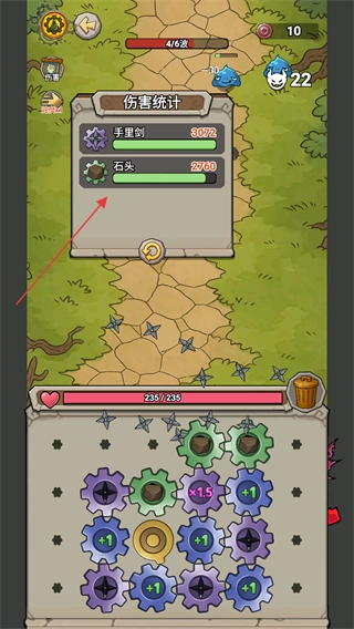 战斗过程中弹出的伤害统计界面,能查看手里剑和石头的输出数据,借助这些信息调整齿轮搭配,有助于提升后续战斗的效率。