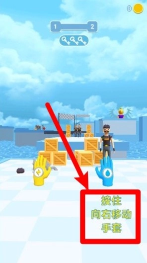 按住屏幕右侧的按钮,就能操控蓝色手套向右移动,借此及时躲开前方的方块与敌人,从而顺利完成相应的动作操作。
