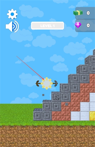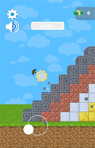 在Level1关卡里,玩家需要操控钻头样式的挖掘工具,朝着由灰色、棕色、白色、黄色等不同颜色方块构成的区域进行发射操作。