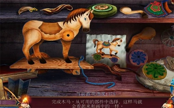 3、最后一个谜题拼装木马,玩家要照图装木马,四个轮子安在木板四周,坐垫放在马背上,蓝色绳子系在马脖子上,就拼装好了。