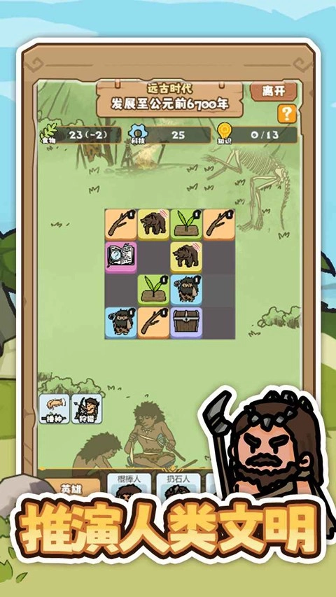 文明推演是一款轻松休闲的合成消除类策略游戏,以原始时期为背景,玩家通过操纵各类图块移动,结合不同图块特性在4X4版面自由布局,将三个相同图块组合消除,以此获取科技值、文化值和粮食等物资。感兴趣的朋友不妨来体验一番!