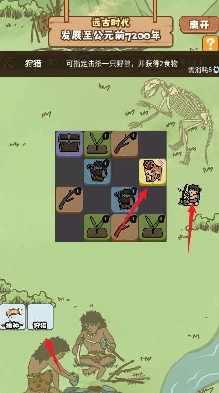 当文明发展到新阶段时,就能解锁【狩猎】技能,用它来应对野兽。