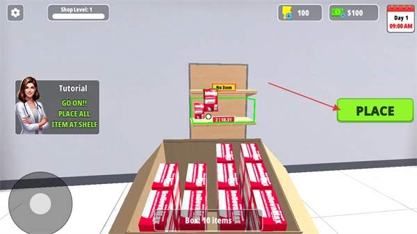 把箱子里的物品放到指定货架上,点击PLACE按钮就能完成放置,一步步做好药房的前期布置工作。