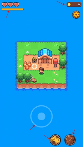 游戏刚开始时,玩家会位于一座小小的岛屿上。岛屿下方的圆形图标可用于操控角色的移动方向;右下方的地图图标需消耗金币来拓展岛屿的面积;书包图标既能用来存放物品,也能通过出售物品来获取金币;左上角的爱心和进度条分别代表角色的体力与能量;而右上角显示的金币数量目前为零。