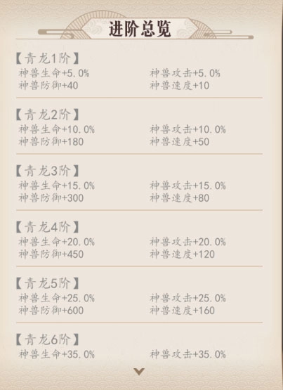 神兽每提升10级就能进阶一次,进阶时需要消耗对应系别的英雄和神兽碎片;神兽碎片可在神兽神殿里对应的种族圣殿中,通过挑战或扫荡的方式获取。完成进阶后,神兽的百分比属性会得到额外提升。